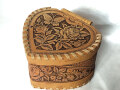 ハート型のヒンジケースにバラの描画が施された白樺細工です。