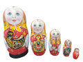 コブロフ工房ジューコヴァ作。アルハンゲリスク、ジョストヴォ、ホフロマ、グジェリなどロシア伝統工芸の雑貨を持った5ピースマトリョーシカです。
