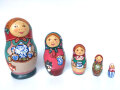 芸術学校の絵画指導教師であり、人気マトリョーシカ作家のタチヤーナ・ドゥビニチさんの小さめ5ピースマトリョーシカ。楽しいお茶の時間を描いています。