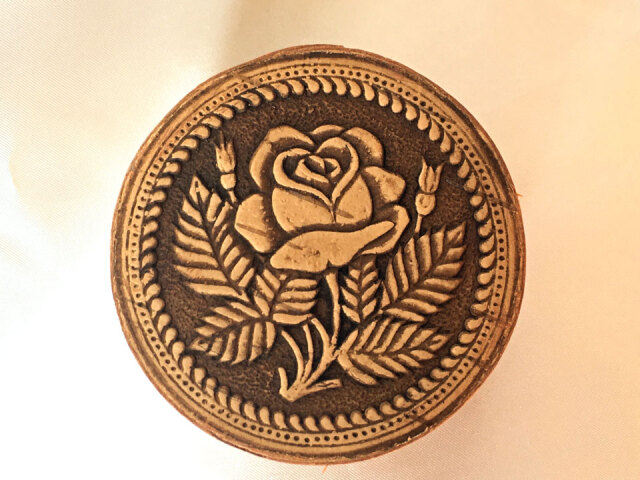 商品説明: 蓋にバラのレリーフが施されたシンプルな作りで小ぶりの白樺ケースです。