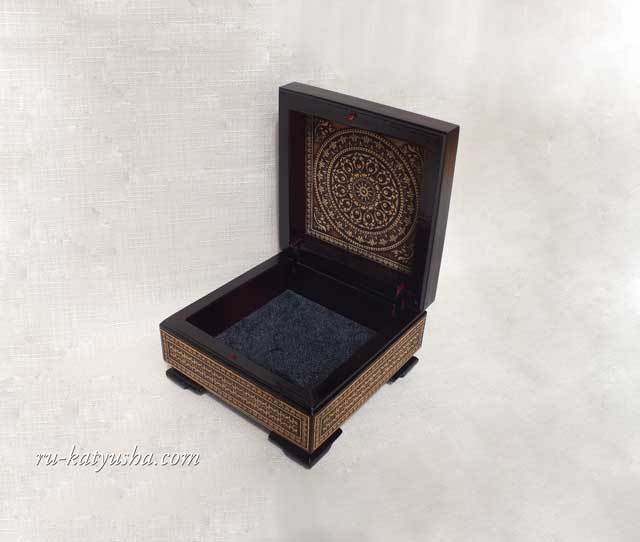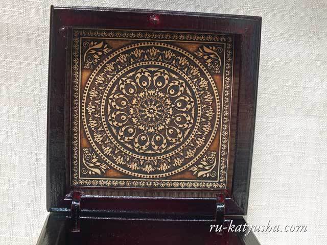 蓋の曲面が宝箱のデザイン性を高めます。 表面の絵柄は、ベレスタ(白樺の皮)にプレスをして焼き付けてあります。 木材の表面に貼り付けてあります。