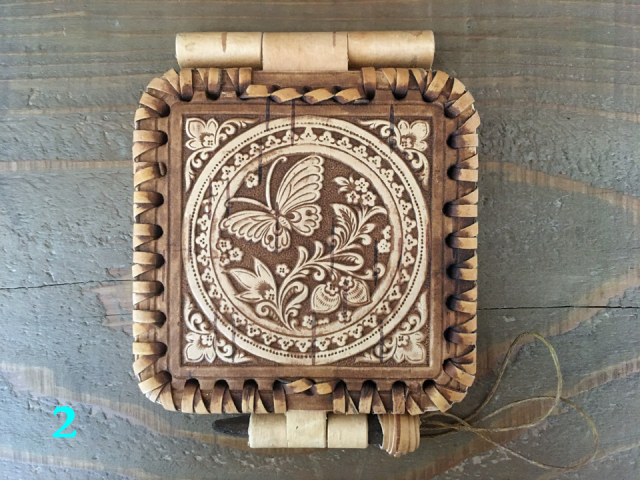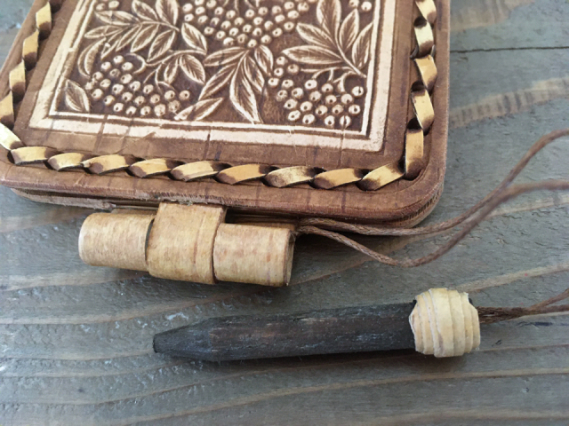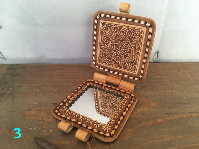 商品説明: 白樺の皮をなめして作ったコンパクト型のミラーです。プレスで焼き付けをすることで美しい図柄を施しています。保護蓋になっているので鞄の中で堅いものと一緒に収納することもできます。