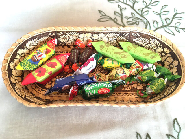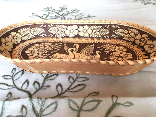 シュッとした細長く美しい形状に、優雅な白鳥の描画が施された白樺細工のトレイです。