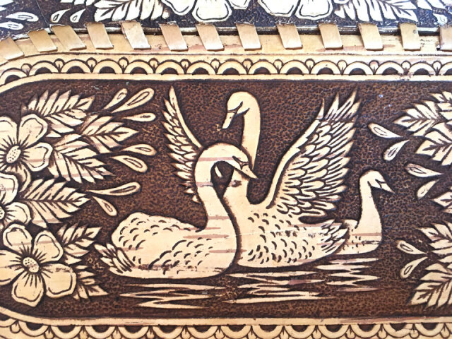 商品説明: スワンの描画を施した白樺細工の細長いトレイです