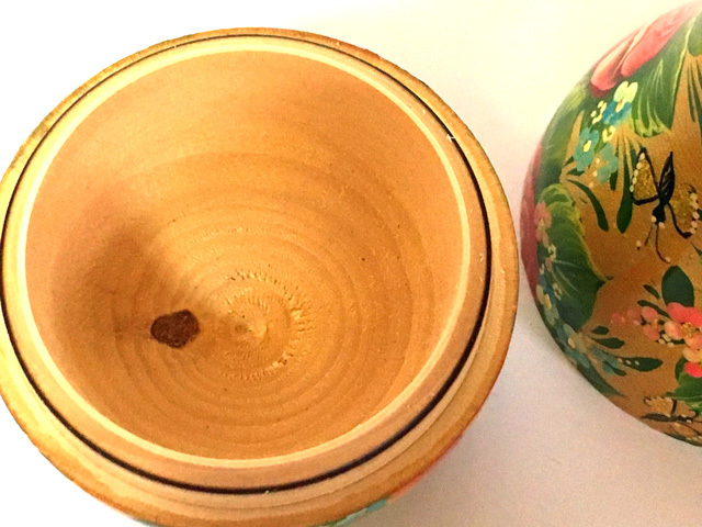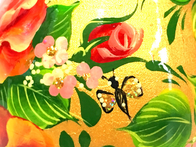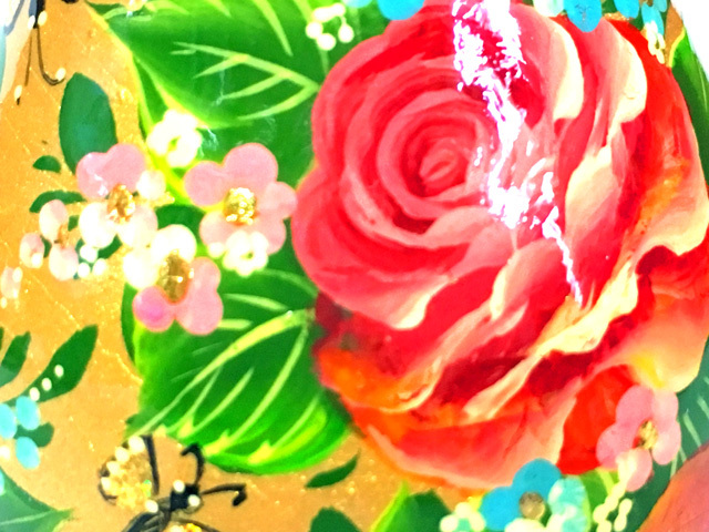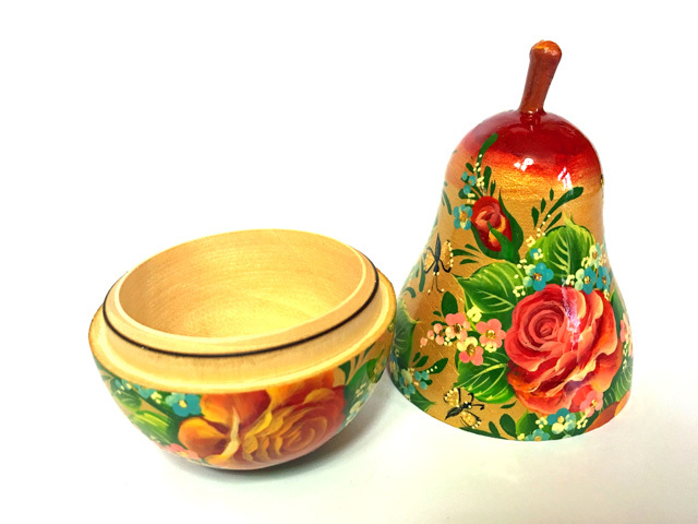 商品説明: 絵付師Kuzminaの手描きによる木製のリンゴ型小箱です。花柄の細かさ精巧さが特徴です。
