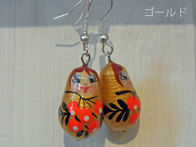 かわいいマトリョーシカを象った木製のピアスです。 もちろんロシアの職人さんが一つ一つ手描きで作っています。