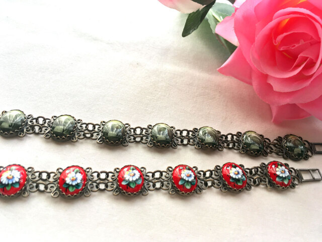 商品説明: ロシアの七宝焼きフィニフチを線状細工で加工したブレスレットです。土台の線状細工はいぶし銀のような黒加工になっており、フィニフチのカラーが際立つよう工夫されています。