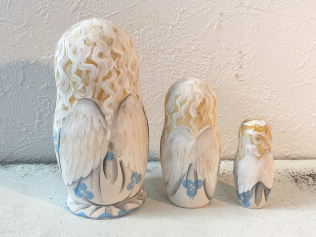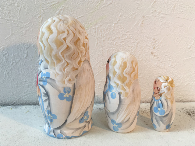 商品説明: コブロフ工房のアーチストであるオレーシャ・スクリジナによる天使の3ピースマトリョーシカです。ニスを施していないマットな仕上がりでオリジナルの絵を最大限に楽しむことができます。