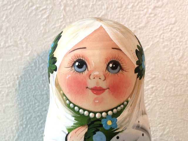 商品説明: コブロフ工房の人気アーチスト、オレーシャ・スクリージナさんのベビーフェイスです。おしゃれをして春の収穫を入れた花かごを持った様子が描かれています。