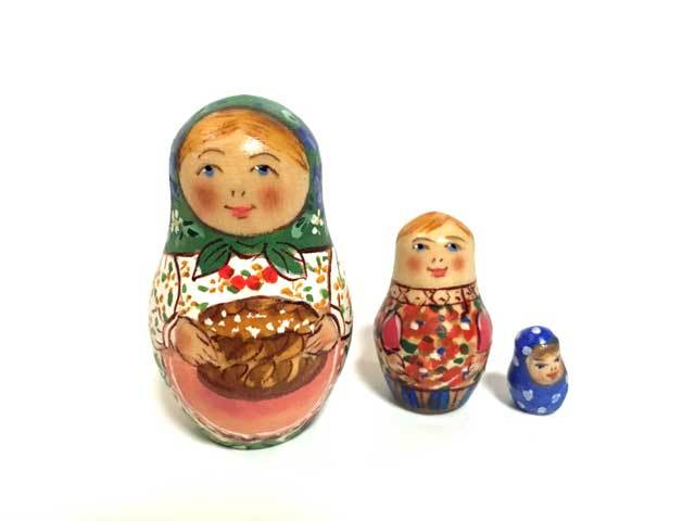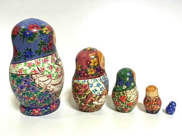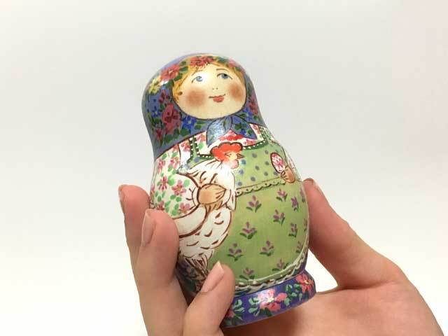 商品説明: コブロフ工房のアーチスト、ダノワさんの小さな作品です。一番大きな人形の高さが10cmと大変小さいボディーに細かく書き込まれた絵柄のミクロ世界をお楽しみください。