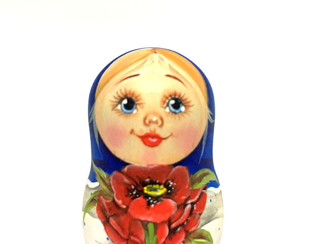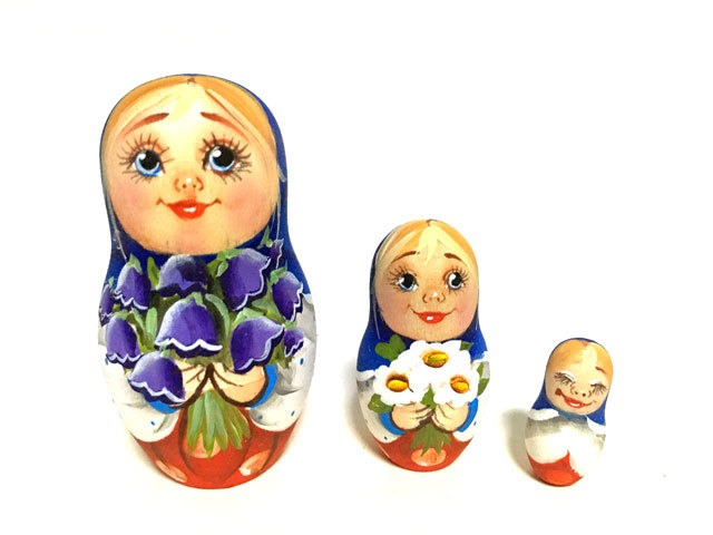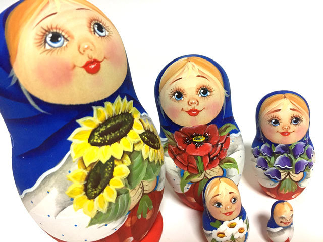 商品説明: ユーリヤ・マカロヴァ作。夏の花々を手に持った少女たちを描いた高さ10cmのマトリョーシカです。