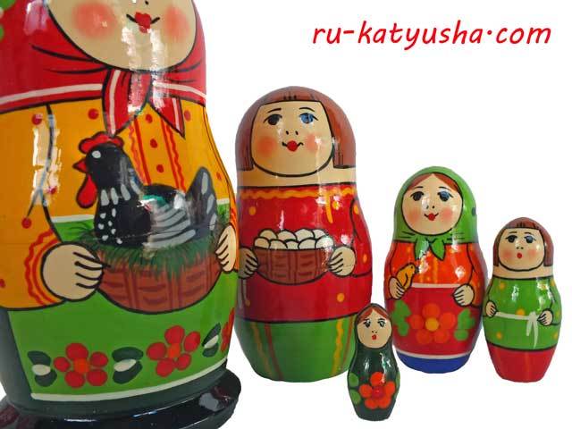 黒い鶏を抱えたクラシックモチーフを採用しています(マトリョーシカの歴史をご参照ください)。ぜひ一つは持っておきたい、もっともロシアらしいマトリョーシカですね!