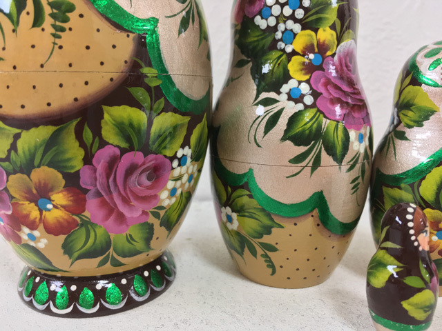 商品説明: 大変ゴージャスな美女を描いたマトリョーシカです。珍しい光沢グリーンがアクセントです。