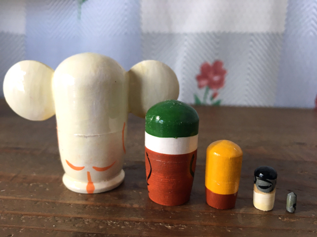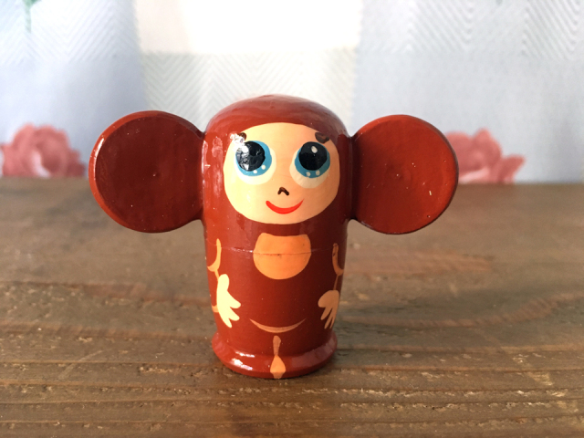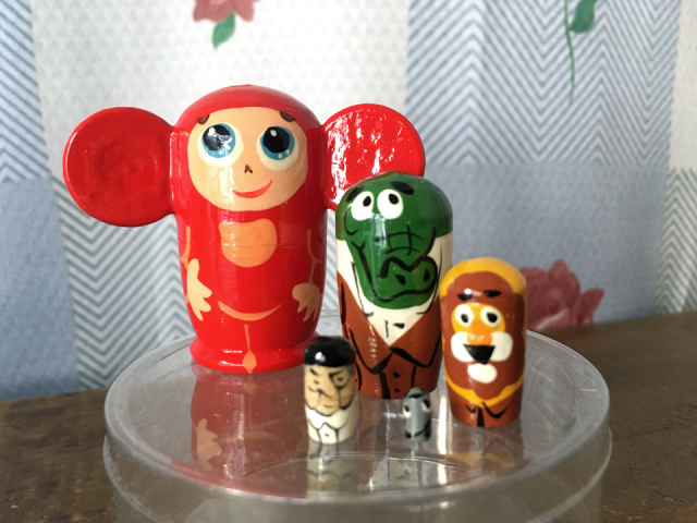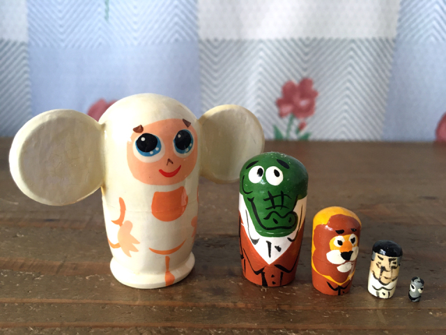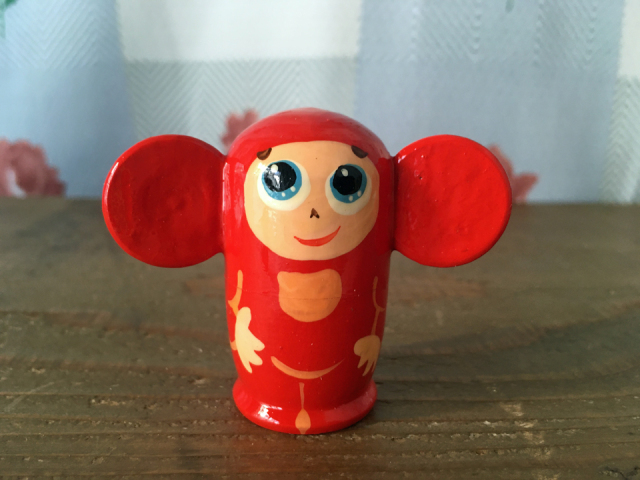 商品説明: 手のひらに載るくらい小さいけど5ピースもあるチェブラーシカと仲間たちのマトリョーシカです