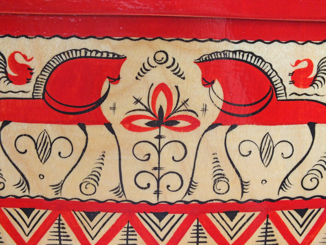 馬、鳥などのモチーフを赤と黒の染料で細かく描いたメゼーニ塗りはアルハンゲリスク地方に伝わる伝統工芸です。