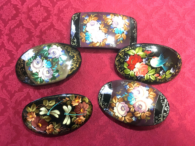 細密画のラッカー製品で有名なフェドスキーノ塗りに起源がつながる「ジョストヴォ塗り」は、モスクワ郊外の「ジョストヴォ村」で主に台所製品への絵付けとして19世紀初めより発展した美しい伝統工芸です。そんな美しいジョストヴォ塗りの製法で絵付けされたとても華やかなバレッタです。